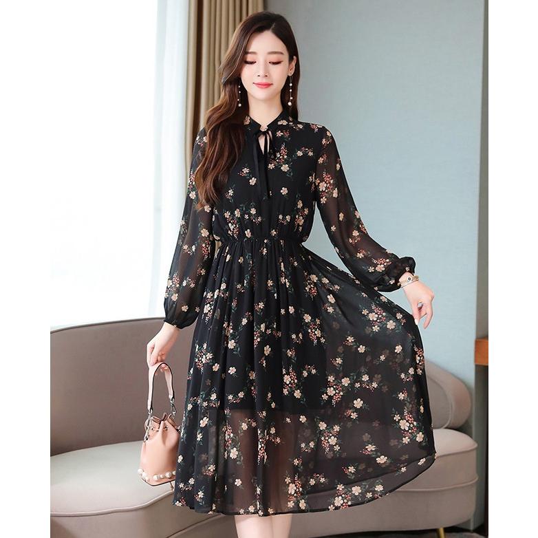 21年秋冬新作 韓国ファッション 長袖 レース 気質リボン シースルーワンピース ロングワンピース